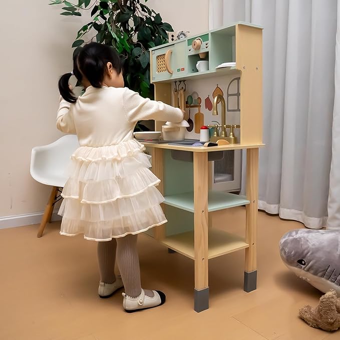 - STABLE CONSTRUCTION: The wooden frame provides excellent support and the stabilizing feet further ensure the stability of the wooden play kitchen, so they won't wobble even when kids place multiple kitchen utensils and food toys on them
