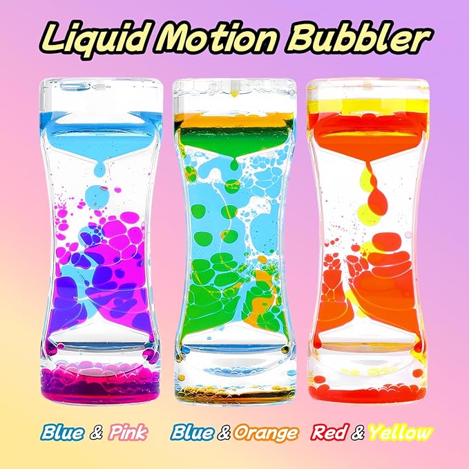 - Liquid Motion Bubbler Sensory Toys: This fascinating liquid motion can be used as a therapeutic toy and stress reliever, it is both fun and stress relieving, loved by children and adults. It requires no batteries or power, just turn it over and it restarts and the energy never runs out