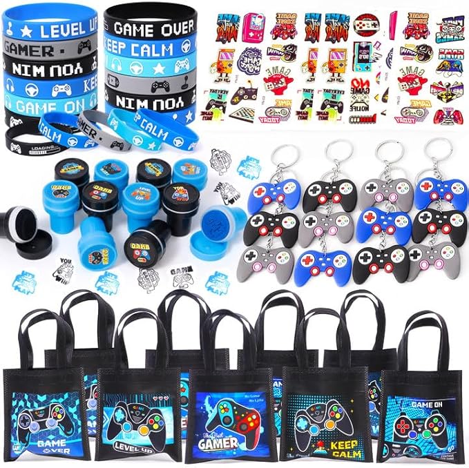 - Video Game Party Favors Supplies: Our blue gaming birthday party favors set includes 12 game party gift bags, 12 game handle keychains, 12 silicone wristbands, 12 stamps, 12 sheet luminous tattoo stickers.These game on party supplies will add color to any of your video themed parties, and all the kids will love this gift set