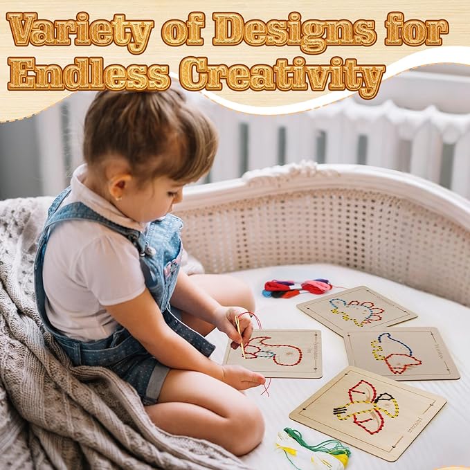 - Montessori Toys: Featuring 4 unique wooden lacing templates, 10 vibrant colors of yarn, and 4 plastic threading needles, offering a rich hands-on exploration and creative experience. As toddlers thread the colorful strings through the holes in the wooden boards, they develop hand dexterity, finger strength, and hand-eye coordination. These skills are crucial for future tasks such as writing, buttoning clothes, and using utensils.