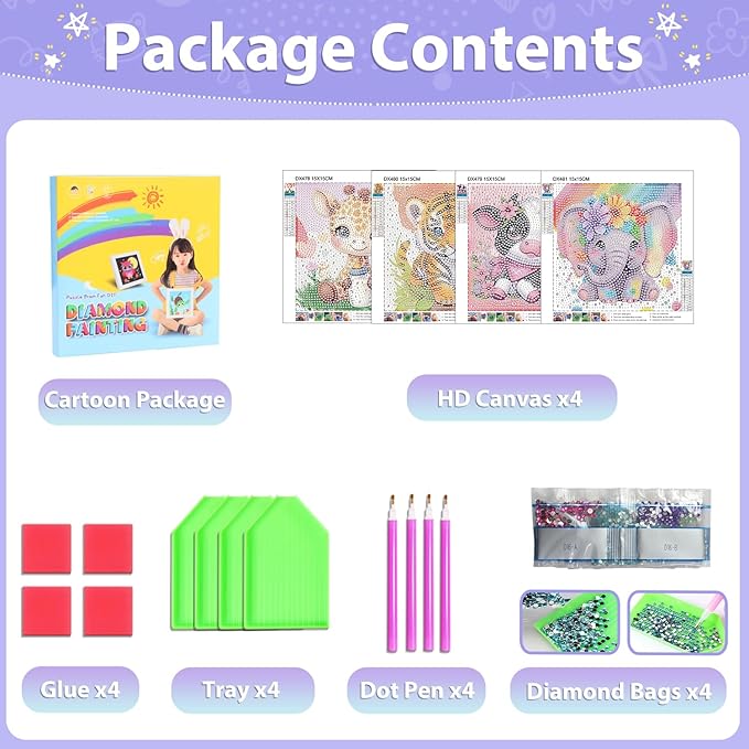- Product Content:Our diamond painting contains:4 diamond pen,4 tray,4 pack of colored rhinestones,4 glue block,1 waterproof canvas,and 1 box,these diamond painting kits are made of non-toxic materials,the glue that comes with the canvas is sticky,non-toxic and odorless,and can be used with confidence