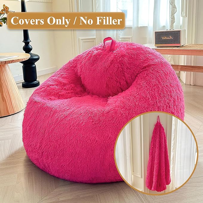 XeGe Fluffy Stuffed Animal Storage Bean Bag Chair Cover(No Filler), Faux Fur Washable Soft Bean Bag Cover for Plush Toys or Textile, Plush Shaggy Large Bean Bag for Adults Kids Teens, Hot Pink