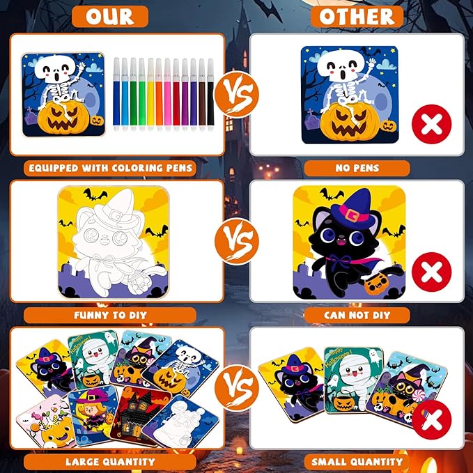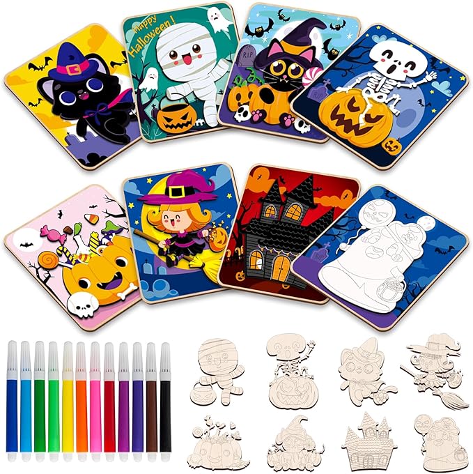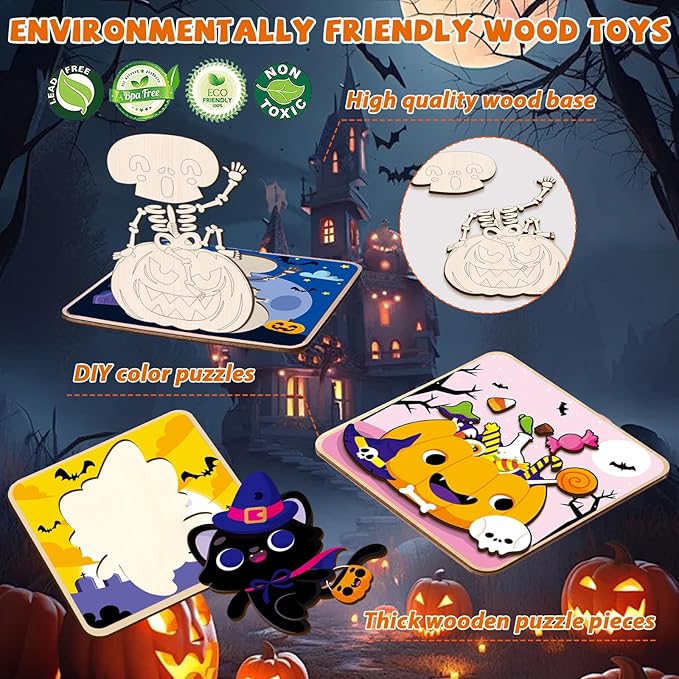 - Halloween gifts designed for kids - This Halloween Wooden Slices for toddlers comprises 8 packs Halloween wooden puzzles that effortlessly fit together, each board measures 14.7*14.7 cm/5.8*5.8 inches. All neatly packed in a vibrant box for easy storage with multiple colors of coloring pens. Designed with 8 styles, this Jigsaw Puzzle for Halloween are wonderful for kids, boys, girls, toddlers, Halloween toys, Halloween gifts, Halloween treats, Halloween party favors, Halloween treat bags.