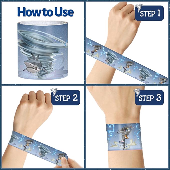 - Tornado Slap Bracelets: Tornado bracelets are made of safe and harmless materials, strong and durable, will not scratch your skin, very safe for children. Put bracelet on your wrist and press lightly, and it will form a comfortable circle and wear it firmly on your wrist. These tornado birthday decorations are printed with various tornado patterns that have different facial expressions and bright colors, kids will love them
