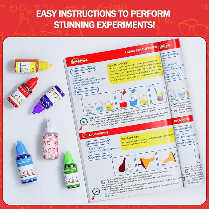 - 【Easy-to-Follow Instructions】Professional scientific instructions with clear illustrations ensure that kids can follow along and complete each experiment with minimal supervision, building confidence and independence. Our instructions clearly show the steps of 70 experiments, the scientific principles, and the usage and dosage of each step.