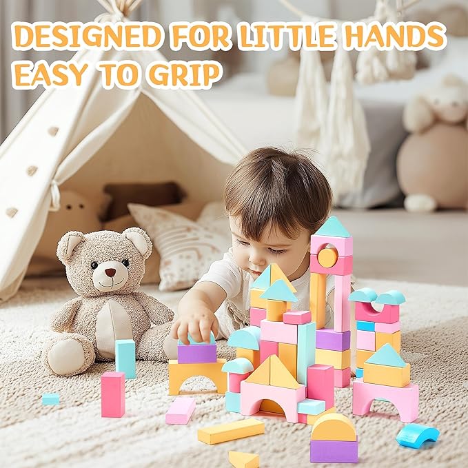 - Educational Fun & Early Learning Tool: More than just a toy, these blocks are Montessori early learning tools. Through block play, children can enhance their color recognition, shape matching, stacking, and sorting skills while stimulating their imagination. The variety of block shapes encourages creativity and cognitive development, helping them improve balance and problem-solving abilities