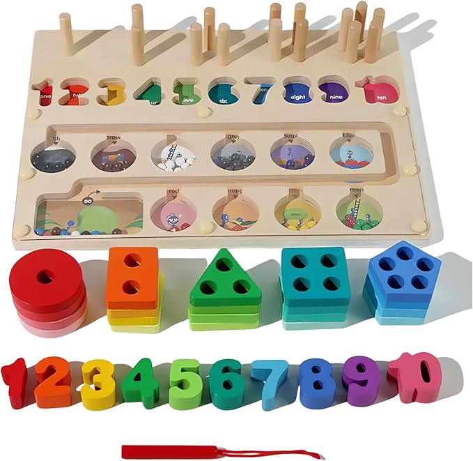 - { MULTIFUNCTIONAL } This 3-in-1 wooden board game combines shape/number pairing, increase and thicken activities for comprehensive learning. Includes 20 stacking shape blocks, 10 number matching blocks, color matching puzzle, 1 wooden board, 1 Magnetic Pen