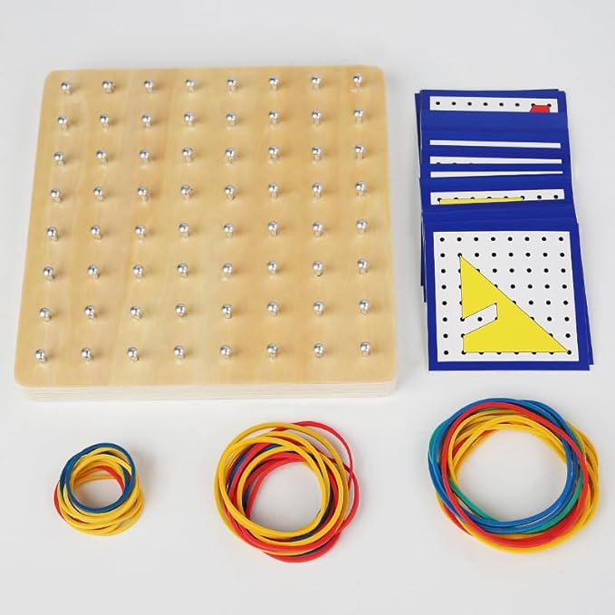 - ๐จ ๐ฃ๐ฒ๐ฟ๐ณ๐ฒ๐ฐ๐ ๐๐ผ๐ฟ ๐๐ถ๐๐๐น๐ฒ ๐๐ฎ๐ป๐ฑ๐ โ Our Montessori-inspired wooden geoboard includes 64 nails, 24 pattern cards, and 60 colored rubber bands, designed ergonomically to fit perfectly in your childโs little hands. Kids can create various geometric shapes, letters, animals, and other objects, stimulating their imagination and creativity.