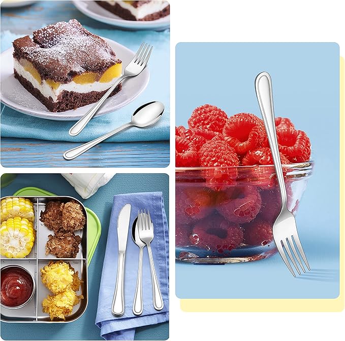 - REAL SILVERWARE FOR KIDS: Metal silverware withstand everyday use without chipping, breakage, or worrying about children biting the tines, With simple slimline pattern as adult’s flatware, Makes children feel like grown-ups and encourage them to eat independently