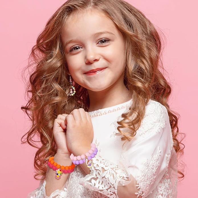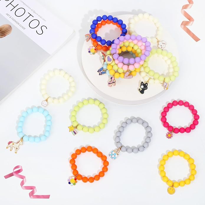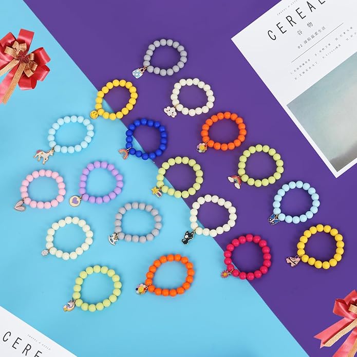- 【Kid Bracelet set】 including 18pcs clorful bright rubber beads, giving people a cheerful feeling. Choose blue, purple, orange, pink, red, match with small monster, unicorn, meteor, rainbow pendant, as shown in the picture.