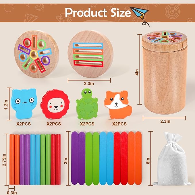 - What you get: 1pc montessori toys with 2 lids, 10pcs wood sticks , 10pcs Ice cream stick and 8pcs animals coin. Our Montessori toys also come with a canvas drawstring bag so you can take toys on the go