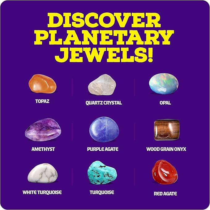 - BLAST INTO GEM DISCOVERY: Uncover hidden treasures from 9 planets, each packed with vibrant, precious gems like amethyst, red agate, and quartz. It’s a thrilling space adventure kids can hold right in their hands!