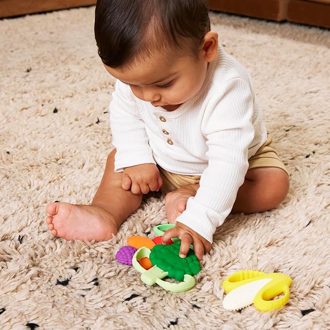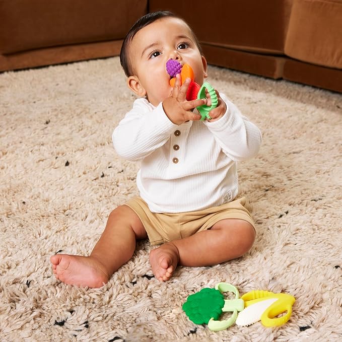 - FRESH PRODUCE INSPIRED SILICONE TEETHERS - Encourage your baby's natural curiosity with this vibrant Farmers Market Gift Set! Each colorful fruit or veggie teether is BPA-free, easy to grasp, and designed to help soothe tender gums. Perfect for engaging and developing essential motor skills