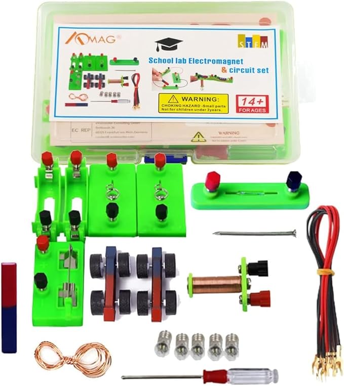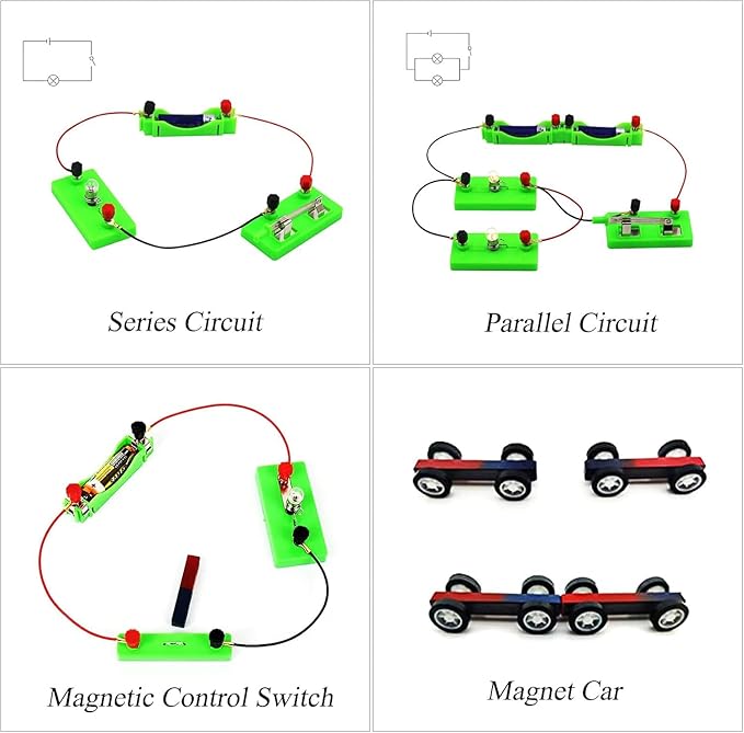 - 【MAGNETISM EXPERIMENT】- Electricity and magnetism kit for students can set up many projects: Magnet Car, Homemade Electromagnet, Simple Circuit, Series Circuit, Parallel Circuit, Magnetic Control Switch and other interesting projects. Physics lab kit with a list of experiments, help children to complete the experiment better.