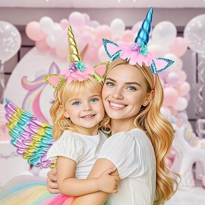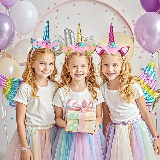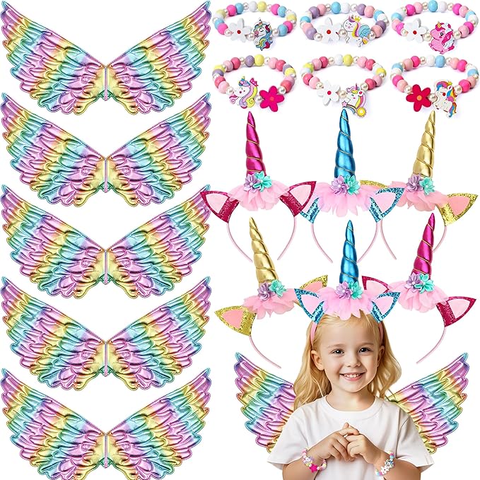 - Girls Unicorn Party Favors - You will get 6 rainbow unicorn wings, 6 unicorn horn headbands (3 colors) and 6 unicorn bracelets (6 types). Dive into the realm of fantasy and sparkle with our unicorn birthday party favors, the great ensemble for Halloween, costume parties, or any magical occasion where you want to shine bright! These unicorn birthday party supplies will make our girls dress up like princesses. Kids and adults alike will love