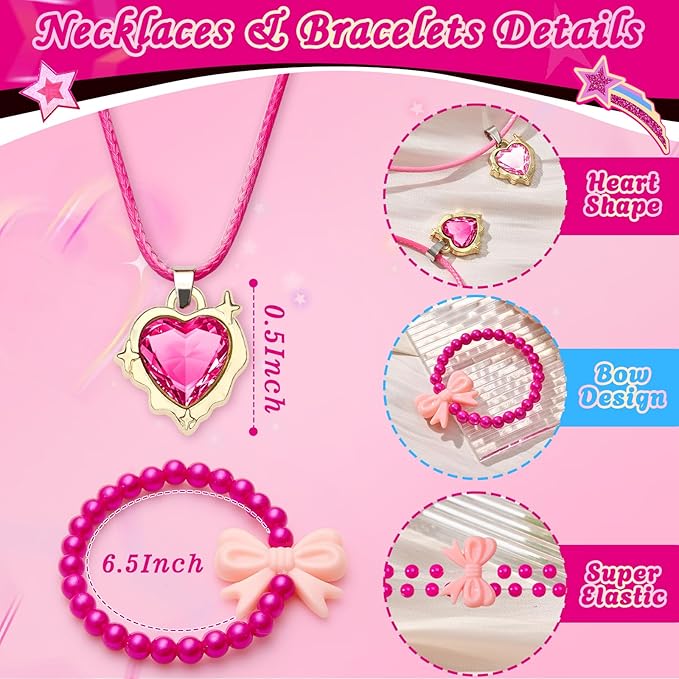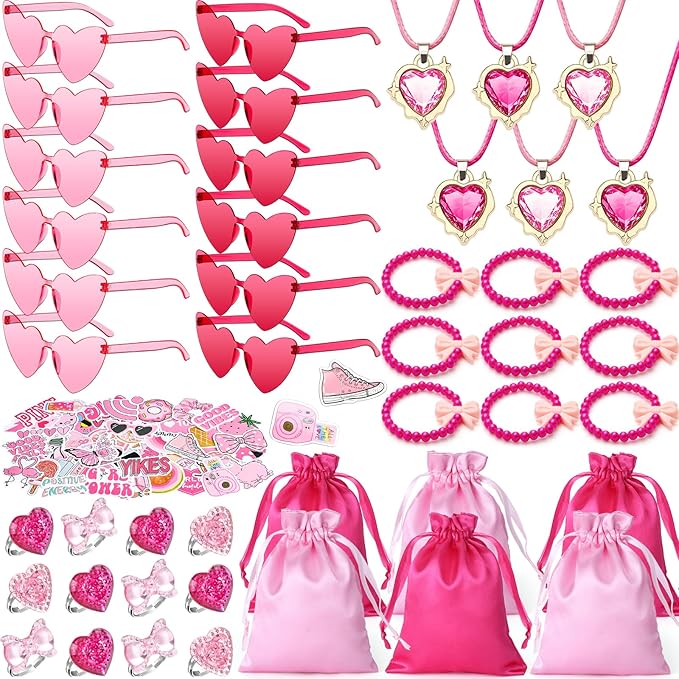 - Exquisite Pink Design - Our Pink Party Favors stand out with their unique design, featuring a soft, pastel pink hue that exudes sophistication and charm. Heart-shaped pink glasses and necklaces, bracelets and rings with bows, pink silk gift bags, and stickers with pink hairband elements all highlight its cuteness and uniqueness. This set of pink party supplies will capture the hearts of girls and make them sparkle at the party like little princesses