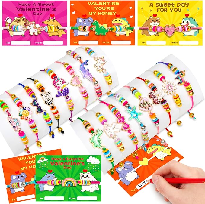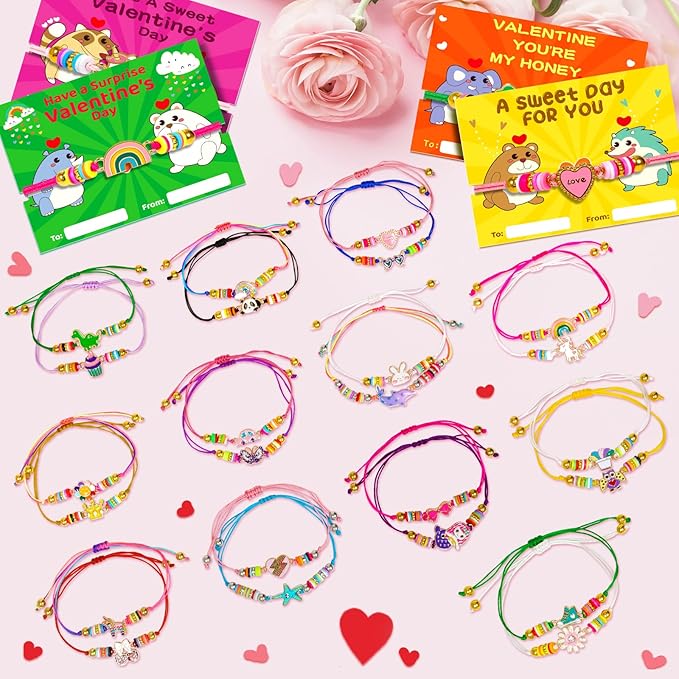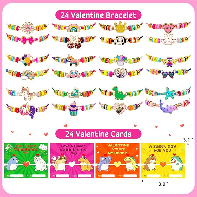 - 【Great Value Kids Valentines Day Gifts】The Valentines boxes for kids come with 24 sets of 24pcs cute bracelets with different style pendants such as unicorn, mermaid, rainbow, owl, dolphin, butterfly etc and 24 cute Valentines day cards. Perfect Valentines day gifts for kids classroom, Valentines day cards for kids school exchange events, preschool bulk Valentines day favors for kids, kids Valentine gifts for boys girls 3 4 5 6 7 8 9 10+ years old.