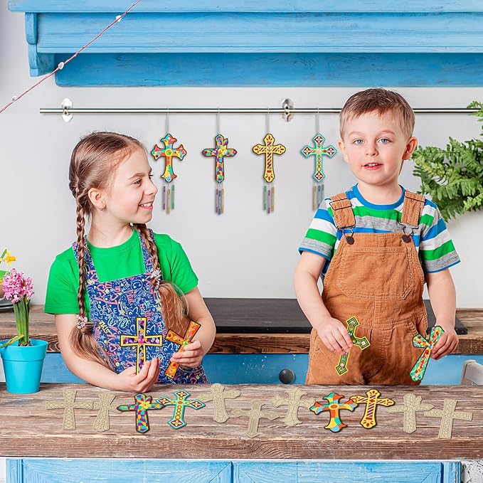gisgfim Easter 16 Pack Cross Wind Chime Crafts Kits for Kids Make Your Own Sunday School Craft Christian Crafts Wooden DIY Arts for Party School Classroom Decorations Supplies Birthday Favors