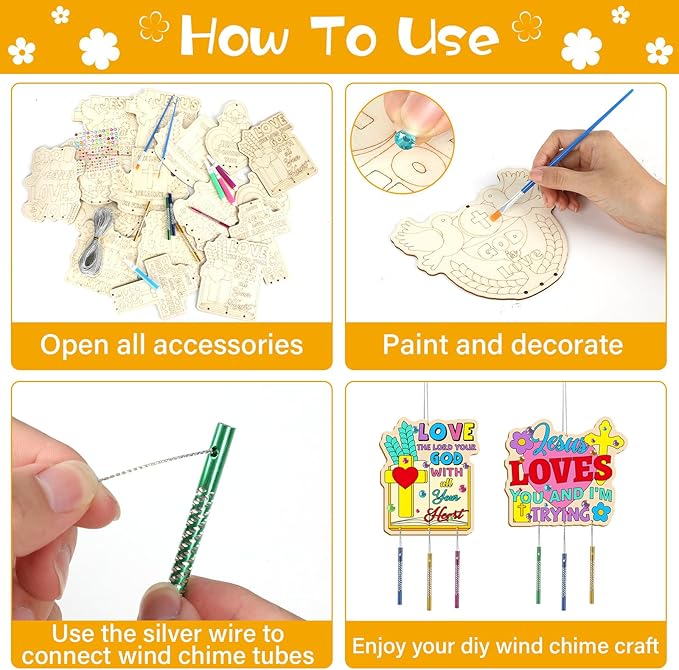 - Religious DIY wind chime kit: Includes 16 pieces of religious unfinished wooden wind chimes(available in 8 styles), 48 pieces of wind chime tubes in 4 colors, silver wire of 65.6ft/20m, 2 sheets of water diamond stickers, 2 paint brushes, a set of 12 color watercolor pens. With ample quantities and diverse styles, it's ideal for children's creative activities, enabling them to craft their own unique christian crafts wind chime.