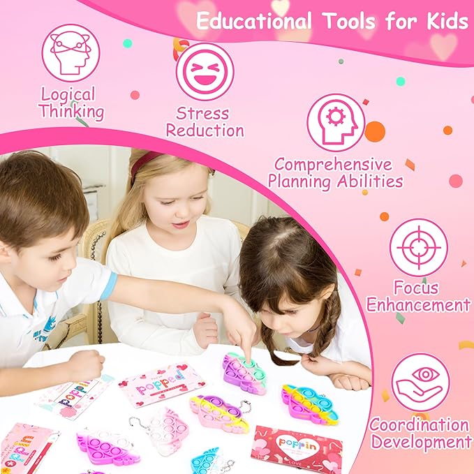 - Super Value Pack: Includes 30 heart-shaped pop fidget keychain toys in 10 unique designs, and 30 Valentine's Day cards in 6 fun designs. Made from high-quality, safe, and durable silicone material.