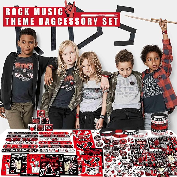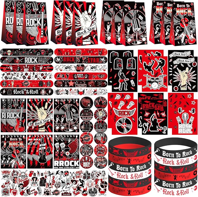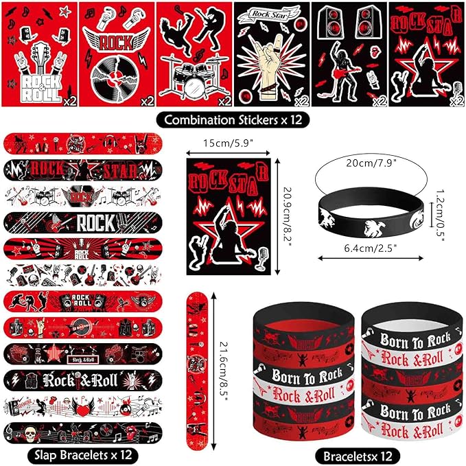 - Rock and Roll Party Supplies: Includes 12 wristbands, 50 luggage stickers , 12 gift bags, 12 slap bracelets, 12 DIY stickers (4 styles), and 12 rock theme button badges, which is enough for kids to share with others to have fun, and you can pack these in the party bags as giveaways for guests.