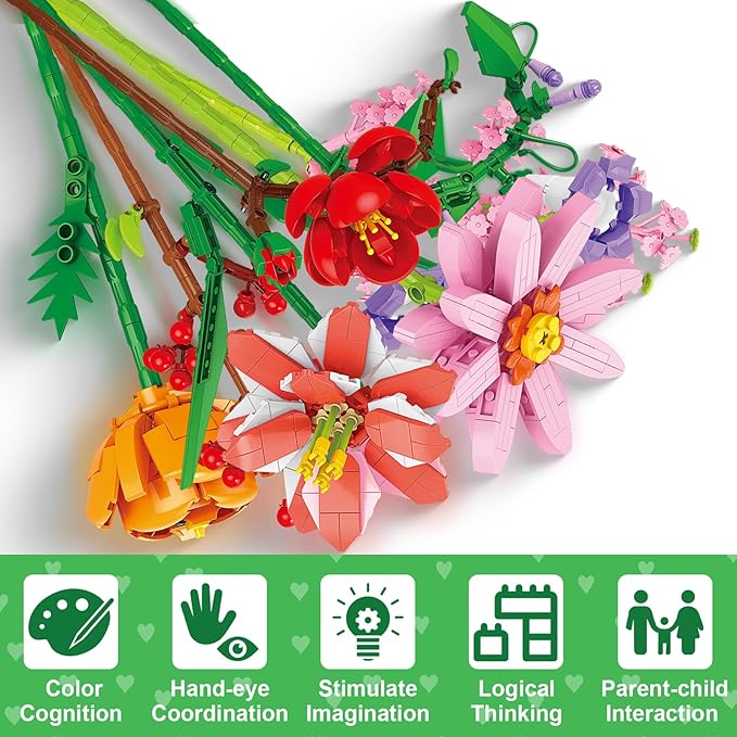 - PLAY AND LEARN VALENTINE TOY : Qinline building blocks party favors adopt unique 24 different types of flowers building blocks, not only allows children cultivate hands-on coordination, imagination, creativity, concentration & develop their logical thinking skills. Fun while fostering their creativity and STEM skills, also will enjoy the building process with their classmates, friends or family via this interactive toys. The fun of the a building blocks lasts well past Valentine's Day