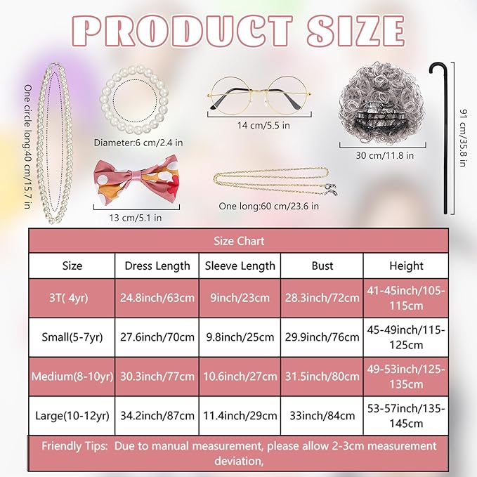 - 【Multiple Size】Pink old lady costume kids is available in 4 different sizes S-XL for girls, suitable for different ages. Please check the size chart to select the appropriate size before purchasing the suit,Manual measurement may have error