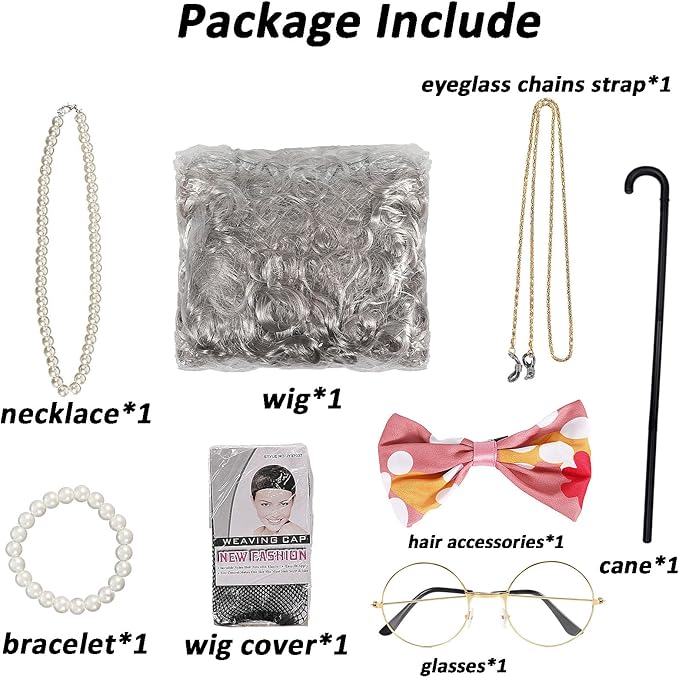 - 【9-Pieces 100 Days of School Costume】Old lady costume for teen girls include a old lady dress, a granny wig, a faux pearl beads necklaces, old lady cane, a granny glasses, a eyeglass chains strap, a grandma wig cover, a bow hair accessories, a faux pearl bracelet