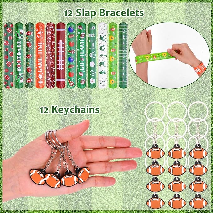 - Football Party Favors: Our set includes 12 football drawstring backpacks, 12 football whistles, 12 football keychains, 12 mini footballs, 12 slap bracelets, 50 football theme stickers, the quantity is enough to meet your daily or party needs.