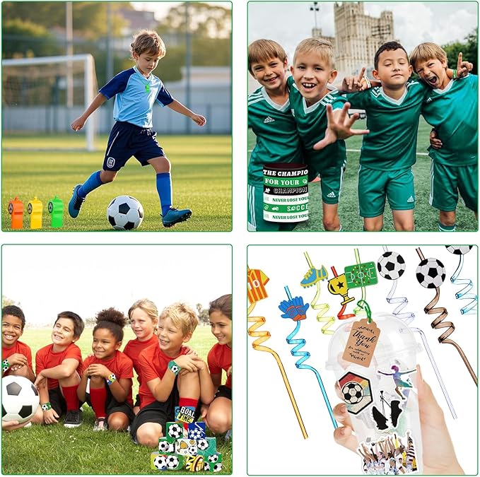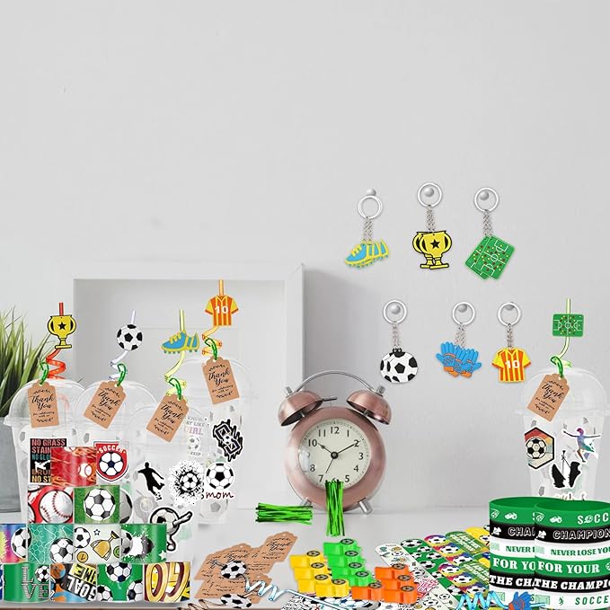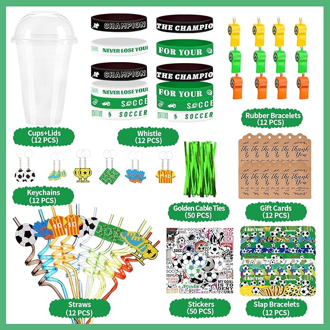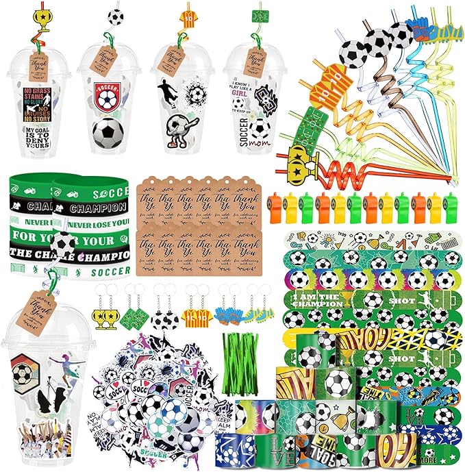 - Large Quantity Soccer Party Favors: You will receive 184 pieces of Soccer party favors including 12 cups with dome lids, 12 Soccer straws, 12 Soccer whistles, 12 Soccer keychains, 12 Soccer rubber bracelets, 12 slap bracelets, 12 thank you tags, 50 twist ties, and 50 Soccer stickers. Enough quantity and styles for your Soccer birthday party favor, meet your daily use