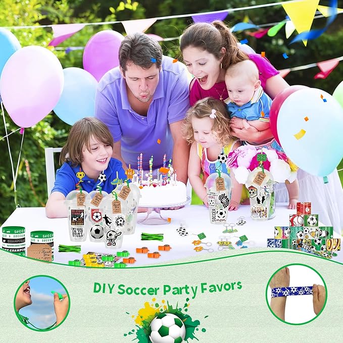 - DIY Your Soccer Birthday Party Favors: You can put Soccer keychains, Soccer rubber bracelets and slap bracelets in the cups. Decorate with Soccer stickers, add a straw and tie a thank you tag with twist ties for a fun, which will bring more joy to your sports party. The fun Soccer birthday decorations will add more fun to your birthday party